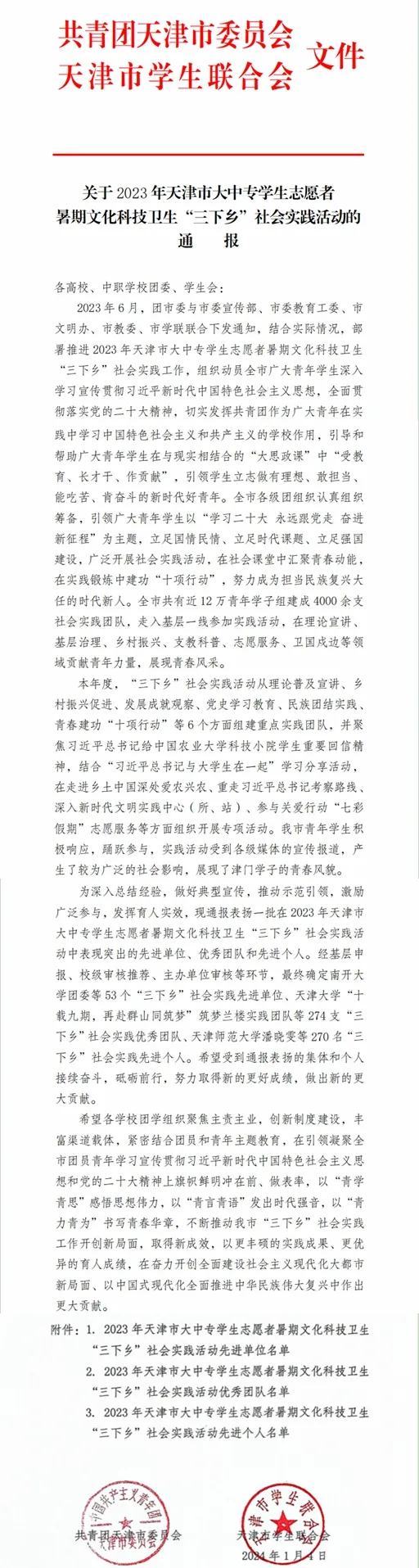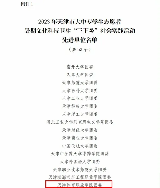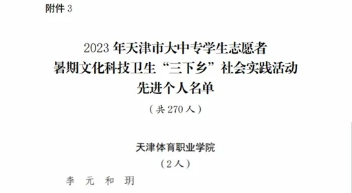 日前🙈,共青团天津市委员会⏺🚼、天津市学生联合会对在2023 年天津市大中专学生志愿者暑期文化科技卫生“三下乡”社会实践活动中表现突出的先进单位⛈、优秀团队和先进个人进行通报表扬🛸,我院荣获多项荣誉。其中👆🏽💹,学院团委组建的“同心同行🧍♂️🐋,青春筑梦”民族团结实践团(带队教师张强)、“振兴乡村‘青’尽全力”实践服务队(带队教师李元)获评优秀团队,院团委委员李元🚴、体育保健与康复系2021级2班学生和玥获评先进个人🎥,我院获评先进单位👩🏼🎓。
