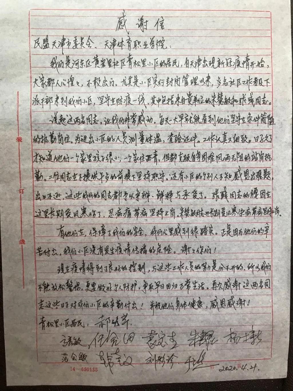 “有他们在🏄🏻♀️,保障了我们的安全,我们心里感到很踏实。正是因为他们的辛苦付出,我们小区没有发生疫情传播的危险💹,谢谢你们🧑🏼🚒🏊!”4月21日,我院下沉河东区黄岩里社区青松里小区干部张彧收到了一封来自社区居民的感谢信。