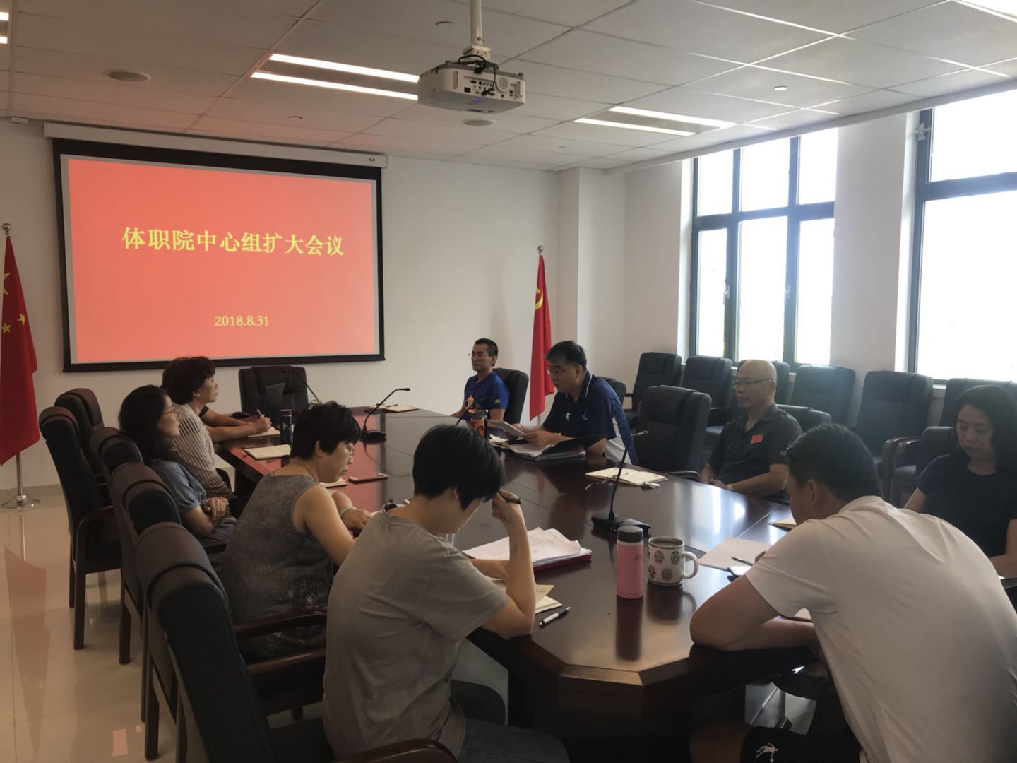 2018年8月31日,体职院在二楼会议室召开中心组扩大会议,学院党委书记王伟出席并主持,学院各处室🏏、系部负责人,各党支部书记参加。