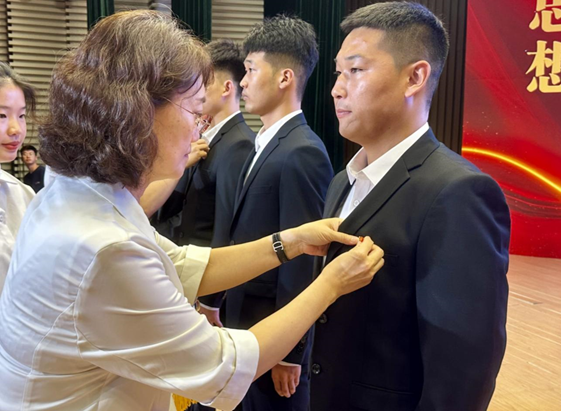 学院党委书记杨军📋、学院党委委员、副院长潘政彬为新发展党员佩戴党徽🖕🏻、发放党章。