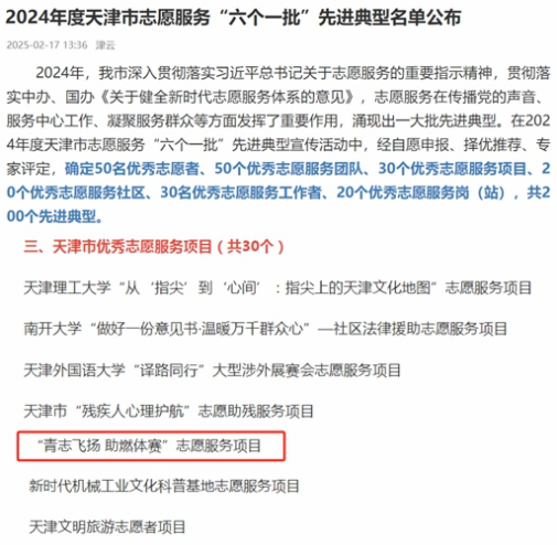 近日,2024年度天津市志愿服务“六个一批”先进典型名单公布👼,由体职院报送的“青志飞扬 助燃体赛”志愿服务项目获评“天津市优秀志愿服务项目”🐥👨🏻⚕️。